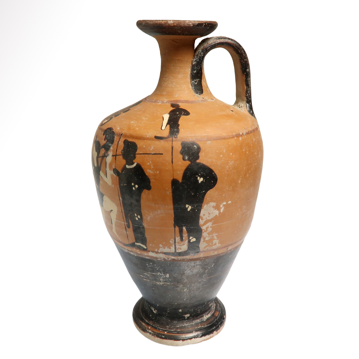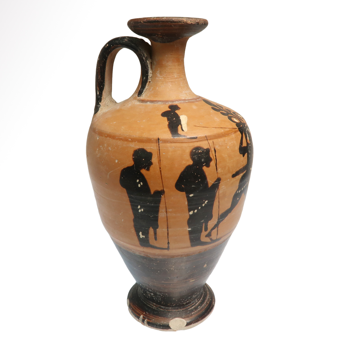 With flared foot, broad shoulder and trumpet-shaped mouth, strap handle to the rear; painted frieze with scene of two warriors fighting on foot with spears, watched by four silhouetted spearmen with pointillé detailing. Exquisite.