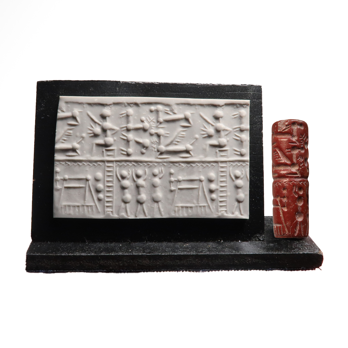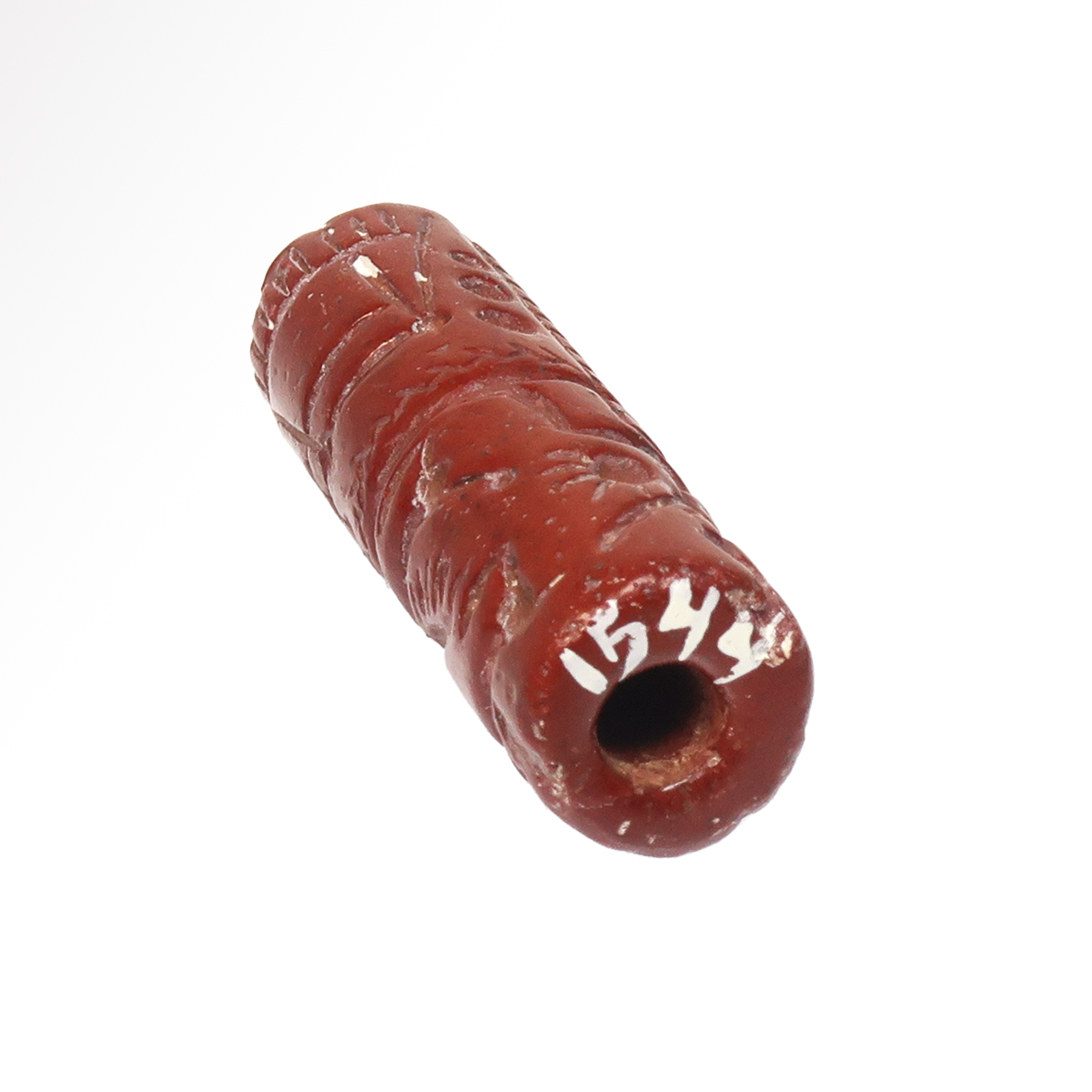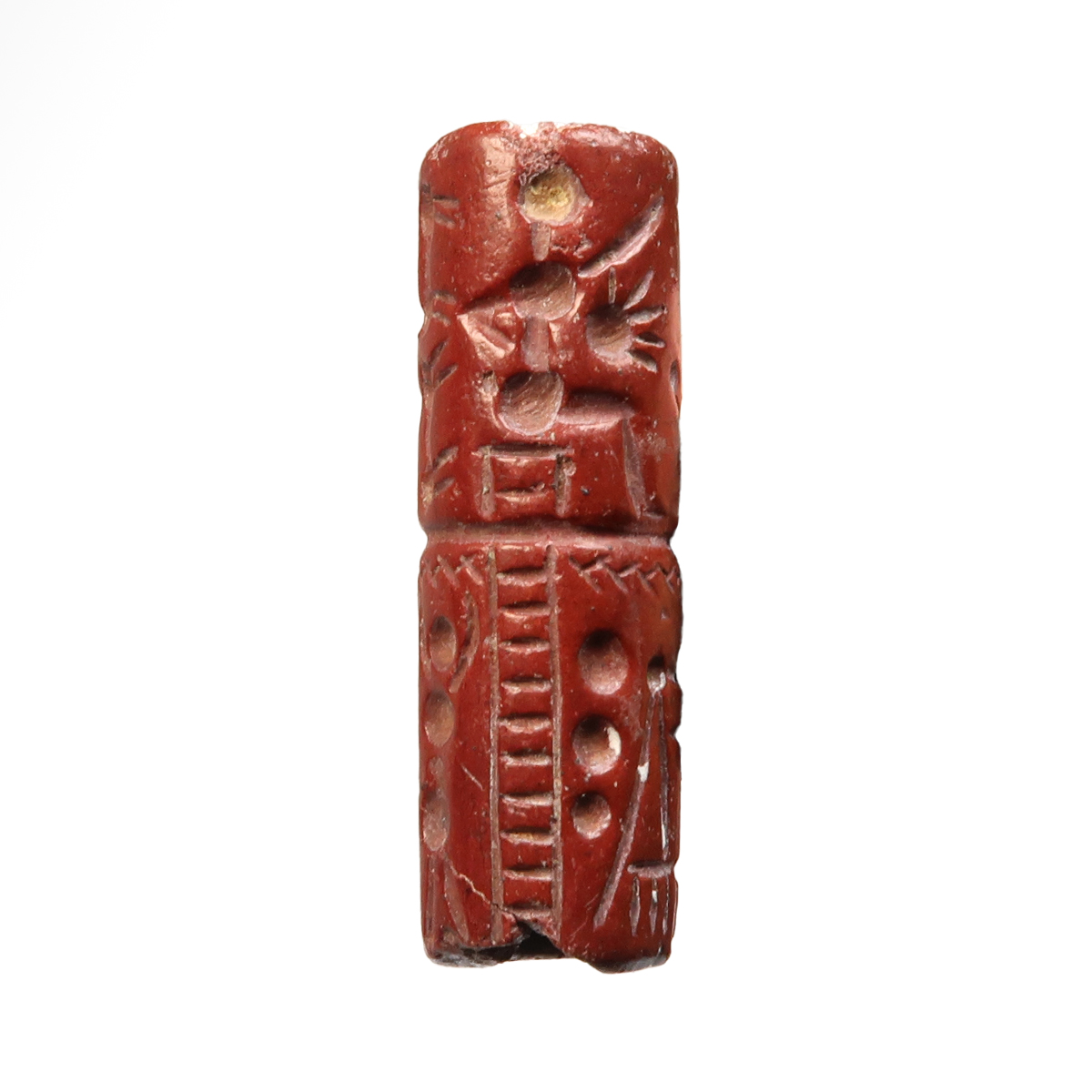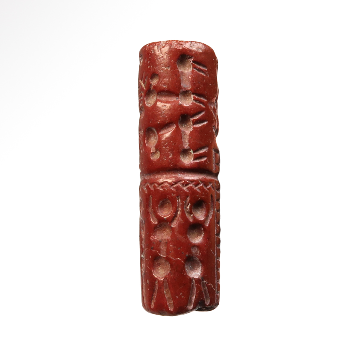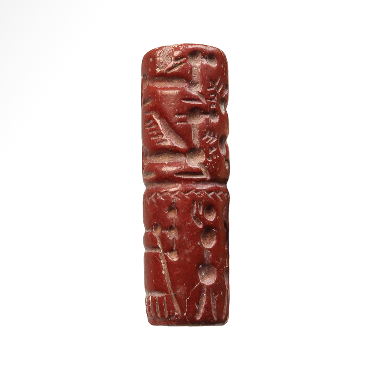 Rare Levantine Red Jasper Cylinder Seal with Complex Scene, Near East, c. 1500-1000 B.C.