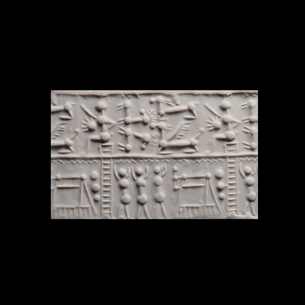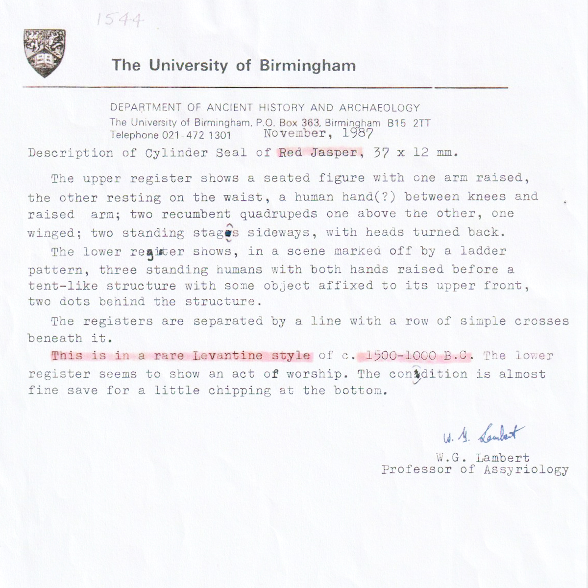 With two rows of human and animal figures, accompanied by a copy of an old scholarly note, typed and signed by W.G. Lambert, late Professor of Assyriology, University of Birmingham, 1970-1993, which states: “Description of Cylinder Seal of Red Jasper, 37 x 12 mm. The upper register shows a seated figure with one arm raised, the other resting on the waist, a human hand(?) between knees and raised arm; two recumbent quadrupeds one above the other, one winged; two standing stags sideways, with heads turned back. The lower register shows, in a scene marked off by a ladder pattern, three standing humans with both hands raised before a tent-like structure with some object affixed to its upper front, two dots behind the structure. The registers are separated by a line with a row of simple crosses beneath it. This is in a rare Levantine style of c. 1500-1000 B.C. The lower register seems to show an act of worship. The condition is almost fine save for a little chipping at the bottom'; accompanied by a museum-quality impression.