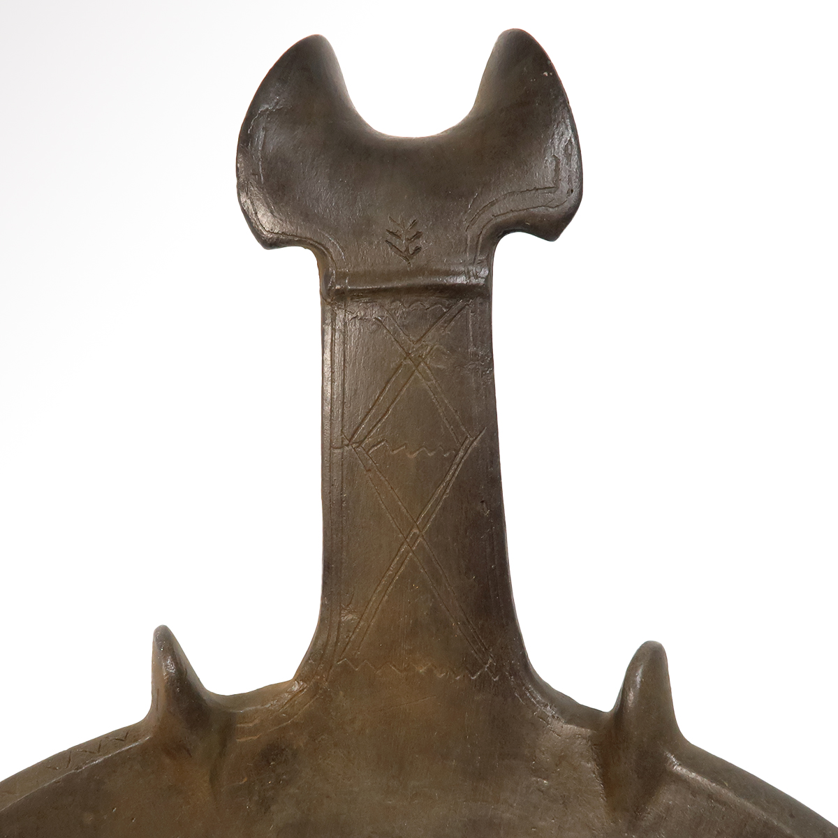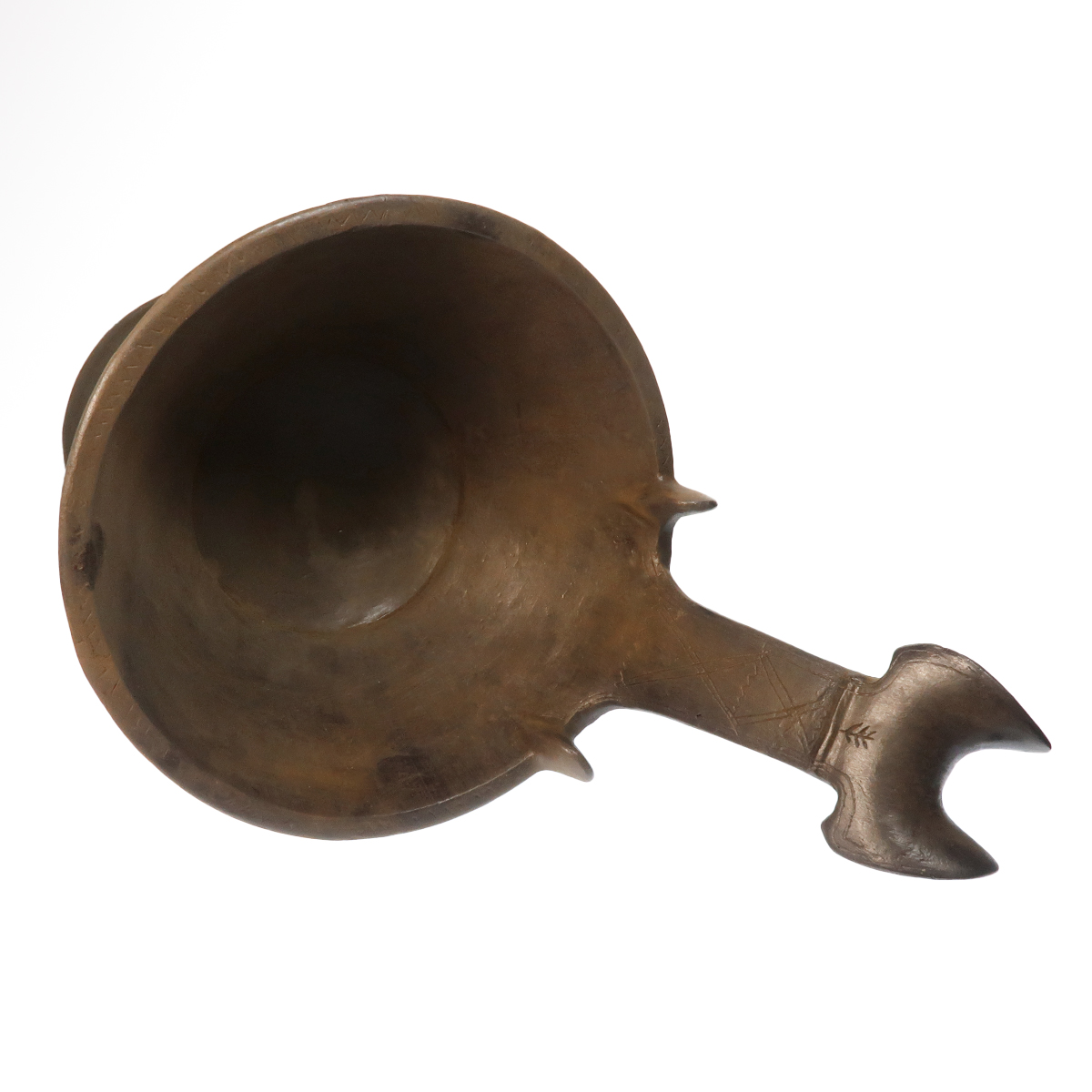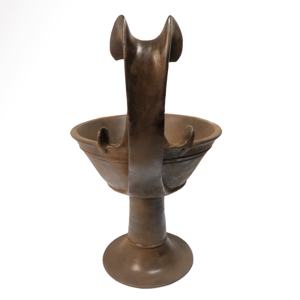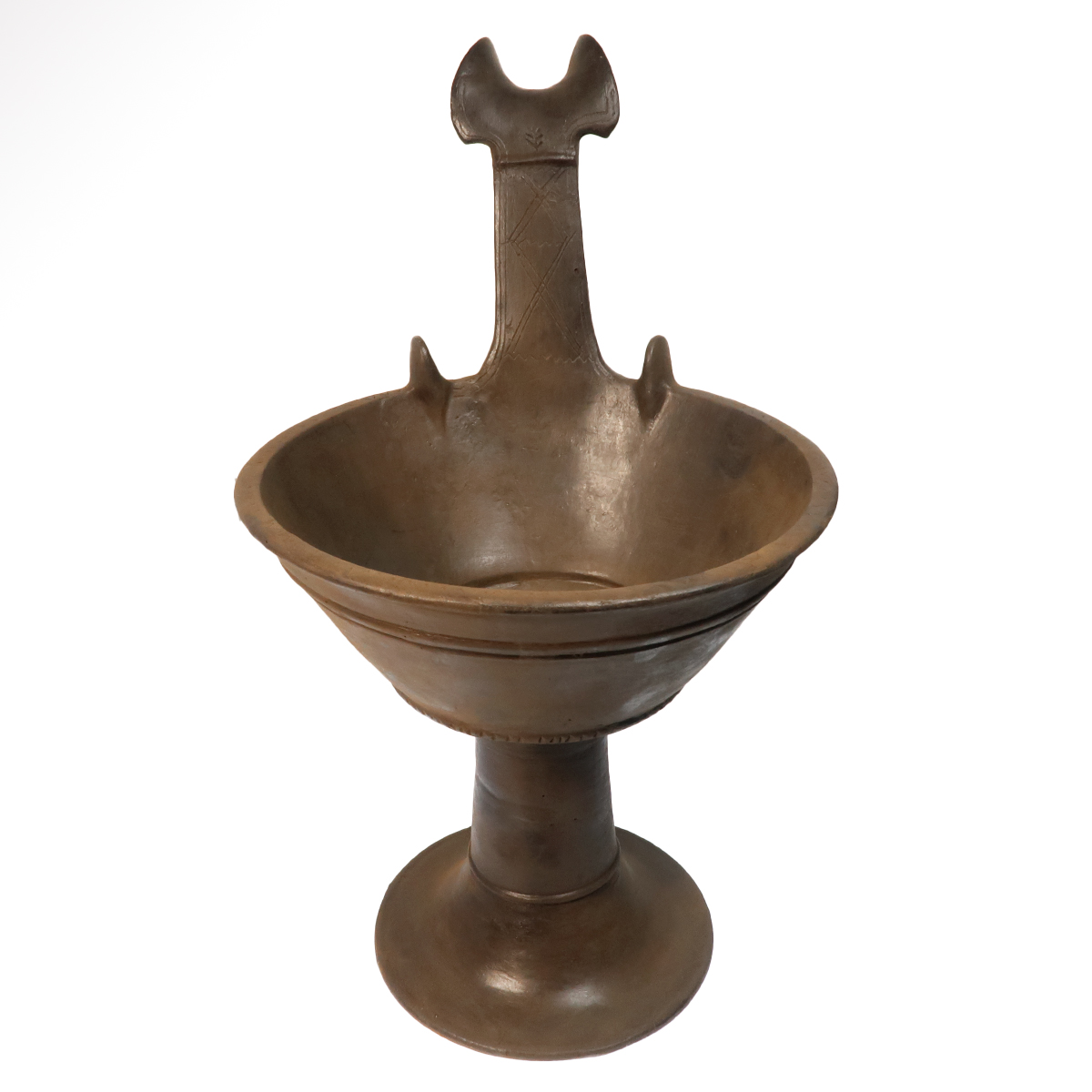On a tall pedestal foot with a high-arched handle, the front panel with incised decoration, rotelles on the rim flanking the base of the handle, a notched ridge around the underside of the bowl, incised zig-zag decoration around the flat bowl rim.