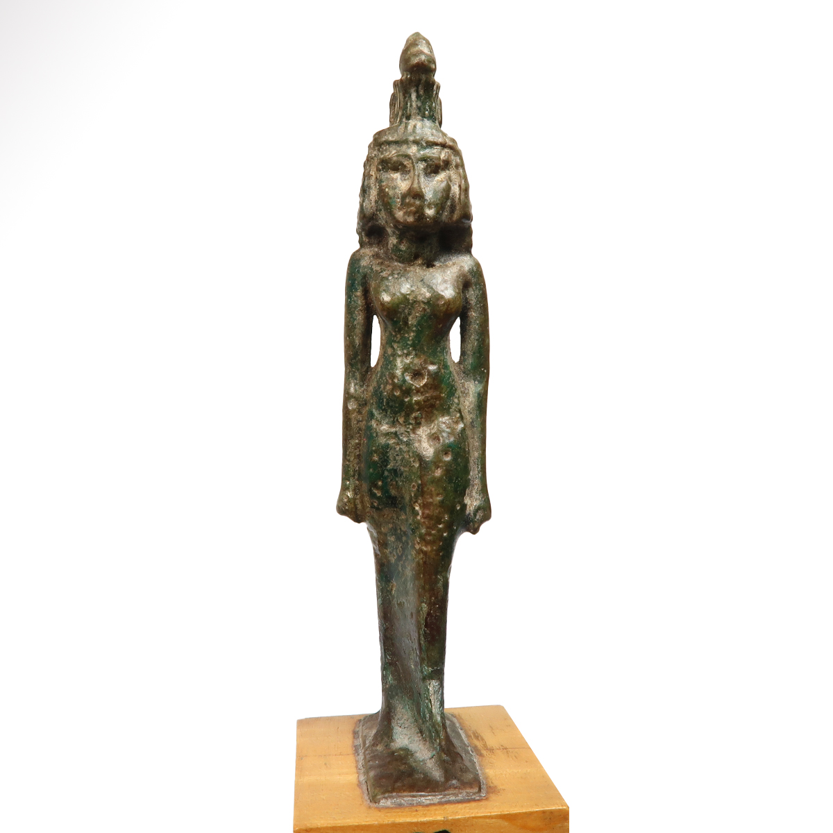 The elegant figure of the goddess finely carved of black faience, standing nude in a striding pose, excellent facial and hair details, clenched fists held at the sides, wearing a schilbe fish atop her crown forming an exquisite headdress.