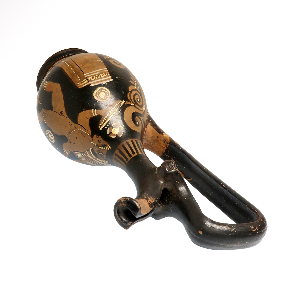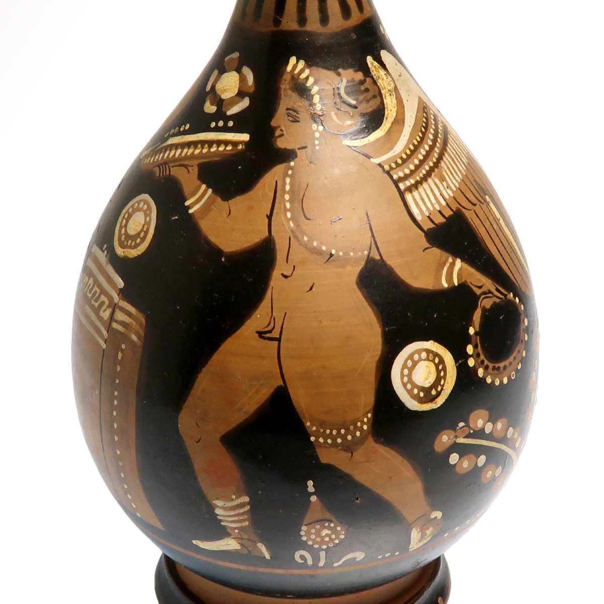 Enlivened with white and ochre slip depicting the figure of a winged Eros holding a tray and wreath, a plant behind him and two columns in front, rosettes fillers. Palmette below the handle. Exquisite.