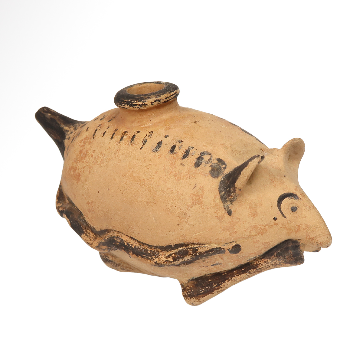 Rare Greek Pottery Figural Leg Shape Aryballos, c. 600-550 B.C.